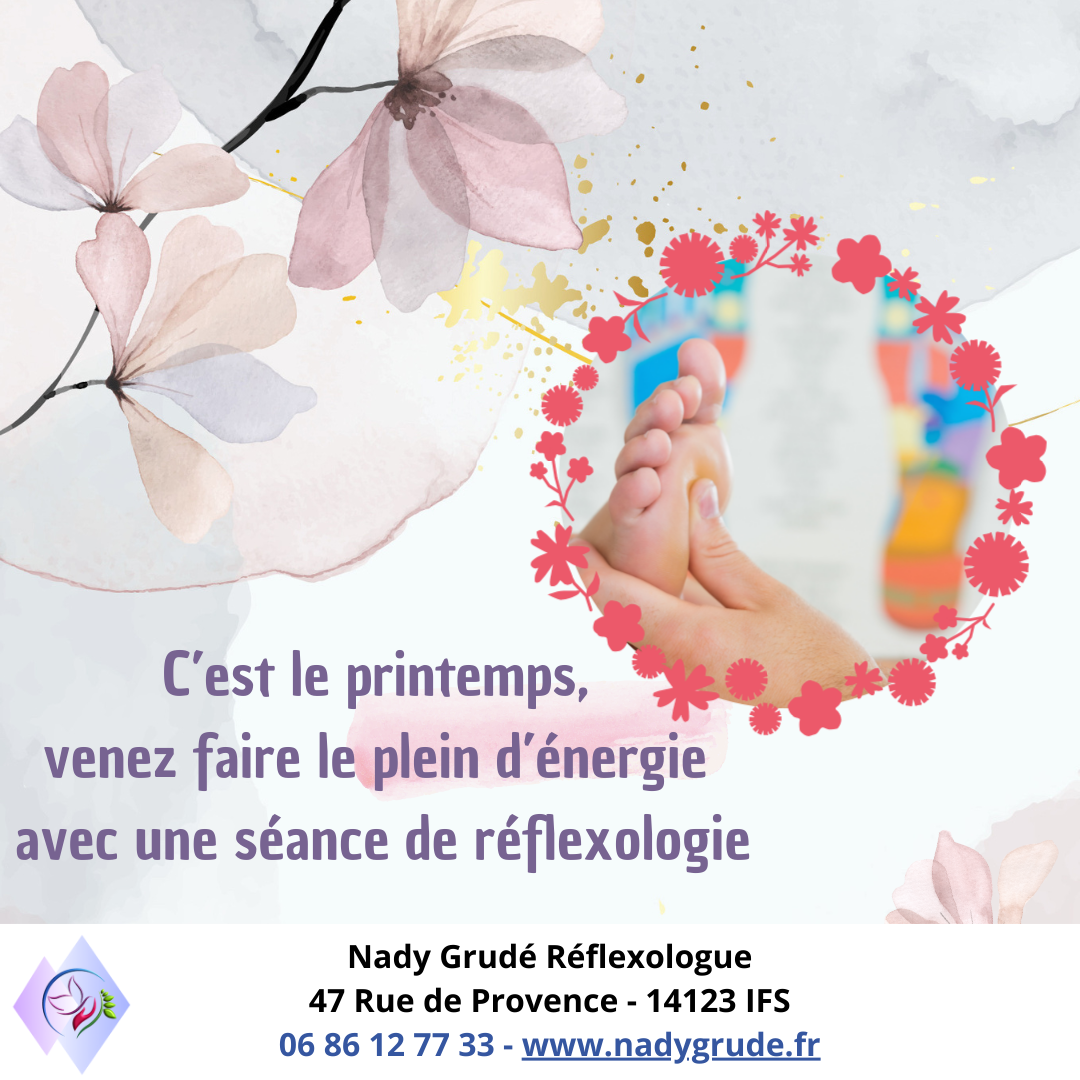 Le printemps arrive ... faites le plein d'énergie Le printemps est à nos portes, et avec lui, l’envie de renouveau et d’énergie retrouvée ! Après un hiver souvent éprouvant, marqué par un manque de lumière, un rythme plus lent et les excès des fêtes, notre corps a besoin d’un coup de pouce pour repartir du bon pied. La réflexologie plantaire est une méthode douce et efficace pour : 🌿 Réveiller votre énergie vitale et recharger vos batteries 🌿 Libérer les tensions accumulées pendant l’hiver 🌿 Stimuler vos défenses naturelles et favoriser l’équilibre intérieur 🌿 Retrouver un bien-être global pour affronter le quotidien sereinement Offrez-vous cette parenthèse revitalisante et préparez votre corps à l’arrivée des beaux jours ! 📅 Les créneaux se remplissent vite ! Prenez dès maintenant votre rendez-vous et offrez à votre corps l’attention qu’il mérite. Je serai ravi(e) de vous accompagner vers un mieux-être durable. À très bientôt, Nady